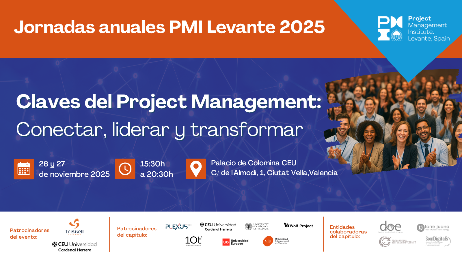 Dado que los proyectos son el motor de la transformación, el PMI Levante nos propone en sus jornadas de 2025 continuar aprendiendo y compartiendo conocimientos sobre cómo mejorar la gestión de proyectos mediante: